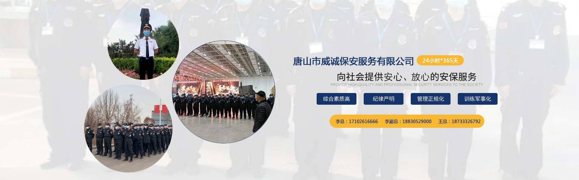 唐山市威誠(chéng)保安服務(wù)有限公司自成立以來(lái)以“嚴(yán)防死守、忠于業(yè)主”為服務(wù)原則,以“客戶滿意、 合作共贏”為根本目標(biāo)。以科學(xué)的管理、多方位多層次的服務(wù),建立了首問(wèn)責(zé)任制,完善了走訪、回訪 、滿意度調(diào)查、末位淘汰的預(yù)警管理,不斷提高服務(wù)質(zhì)量,提高業(yè)主滿意度,提高企業(yè)形象。秉承“誠(chéng) 實(shí)守信,紀(jì)律嚴(yán)明,團(tuán)結(jié)協(xié)作,致精致誠(chéng)”的服務(wù)理念,為客戶提供高品質(zhì)、多方位、專業(yè)化的保安服務(wù)。 本公司制定了嚴(yán)謹(jǐn)?shù)亩ㄏ蛘猩徢芭嘤?xùn)、考核錄用、崗中培訓(xùn)、持續(xù)培訓(xùn)、末位淘汰制等一整套完善的管理體系。可以根據(jù)客戶的要求實(shí)地勘察評(píng)估,以量身定做的方式提供安保防范服務(wù)。